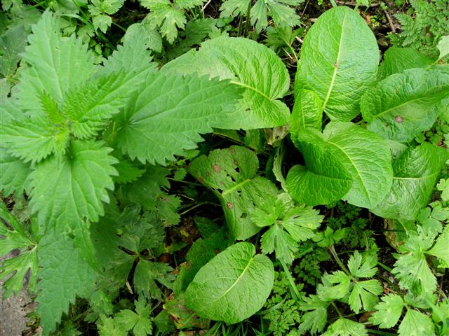Image credit: Copyright by Kenneth Allen. CC BY-SA 2.0. The image shows stinging nettle on the left and dock leaf on the right.