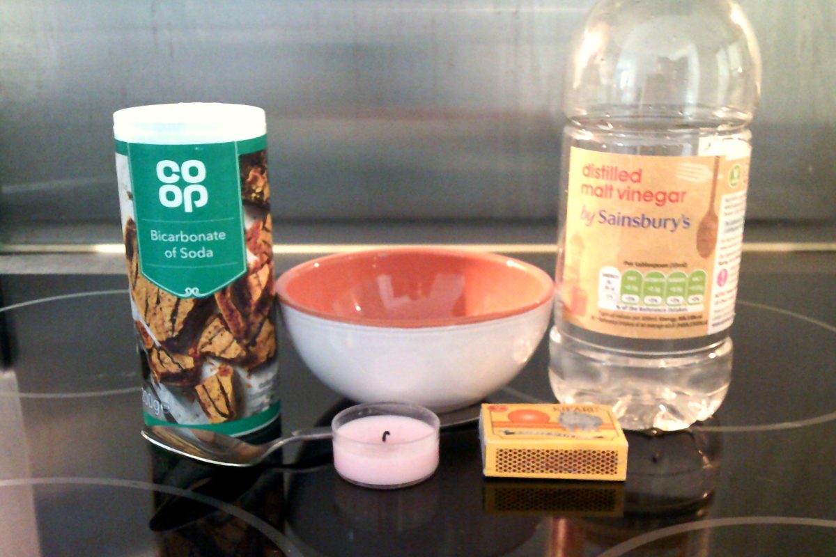 - Slowly add vinegar to the baking soda around the tea light. Be careful not to put the vinegar directly into the flame.